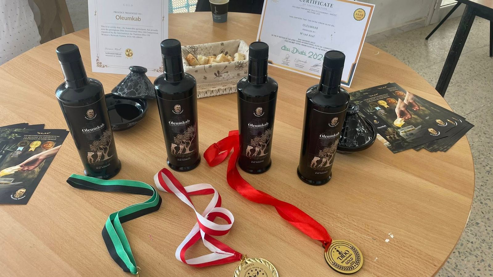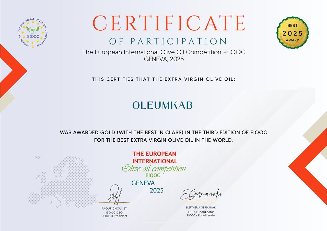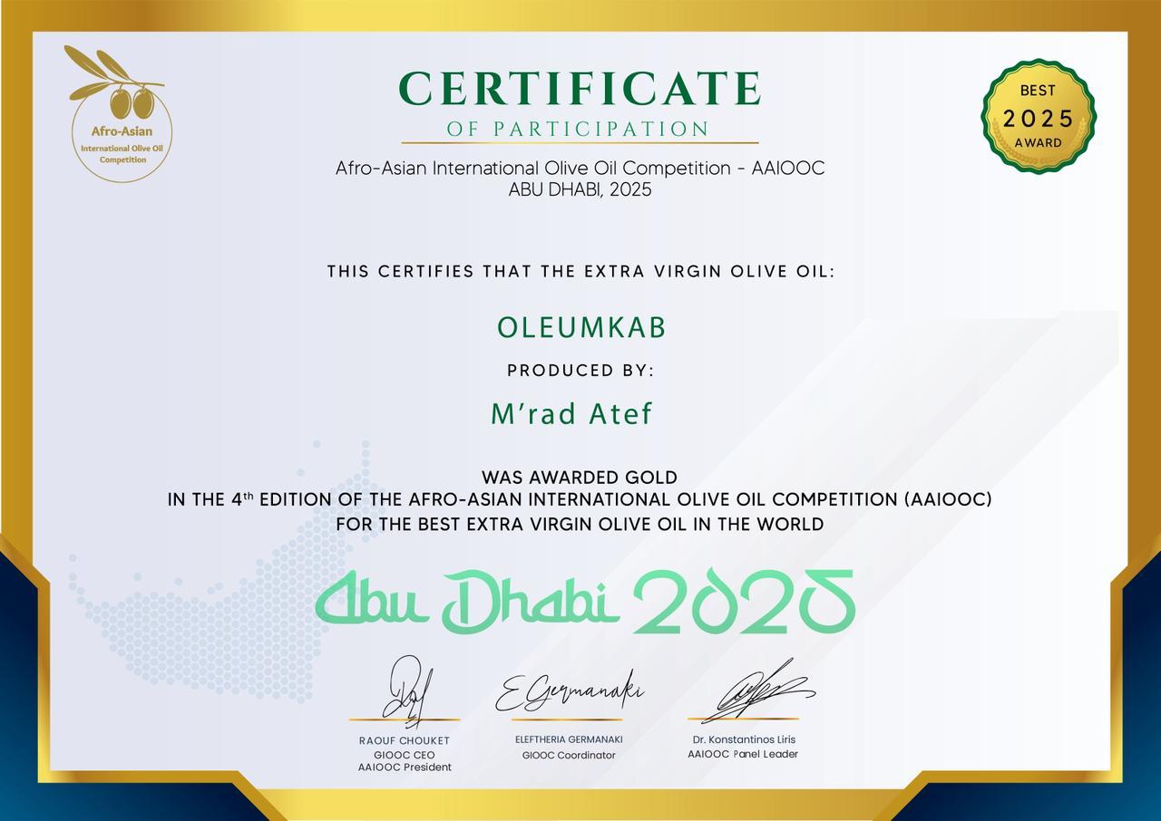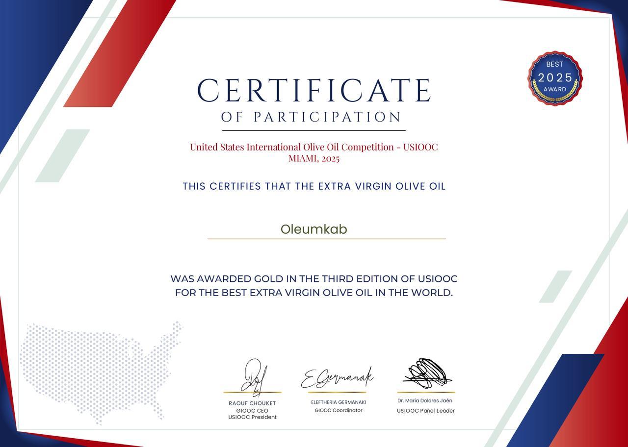 Chez Oleumkab, la passion pour l’huile d’olive de qualité est reconnue à travers le monde. Chaque distinction est une fierté et un hommage à notre terroir tunisien ainsi qu’à notre savoir-faire artisanal. De Genève à Miami, en passant par Stockholm et Abu Dhabi, nos médailles d’or incarnent l’alliance entre exigence et authenticité.